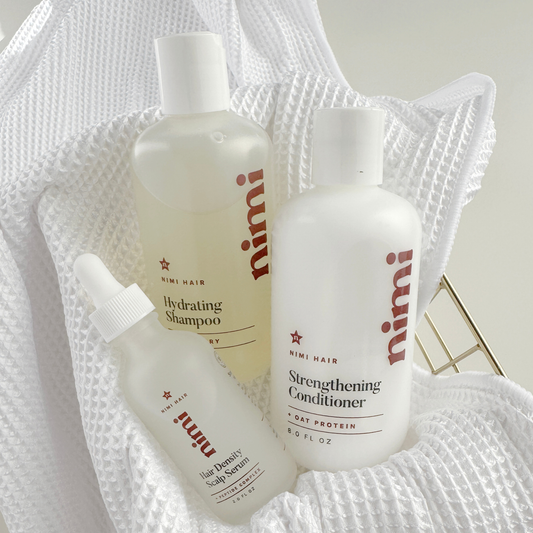 Start with the Hydrating Shampoo, a gentle cleanser enriched with aloe, hyaluronic acid, and hydrolyzed oat protein to help replenish moisture while leaving hair soft and refreshed. Follow with the Strengthening Conditioner, formulated with avocado oil, jojoba oil, shea butter, and ProVitamin B5 to nourish strands and improve manageability. For daily scalp support, apply the Hair Density Scalp Serum to dry or slightly damp hair. This lightweight treatment features rice water, niacinamide, and a targeted peptide complex to help balance the scalp and support the appearance of fuller, healthier hair over time.